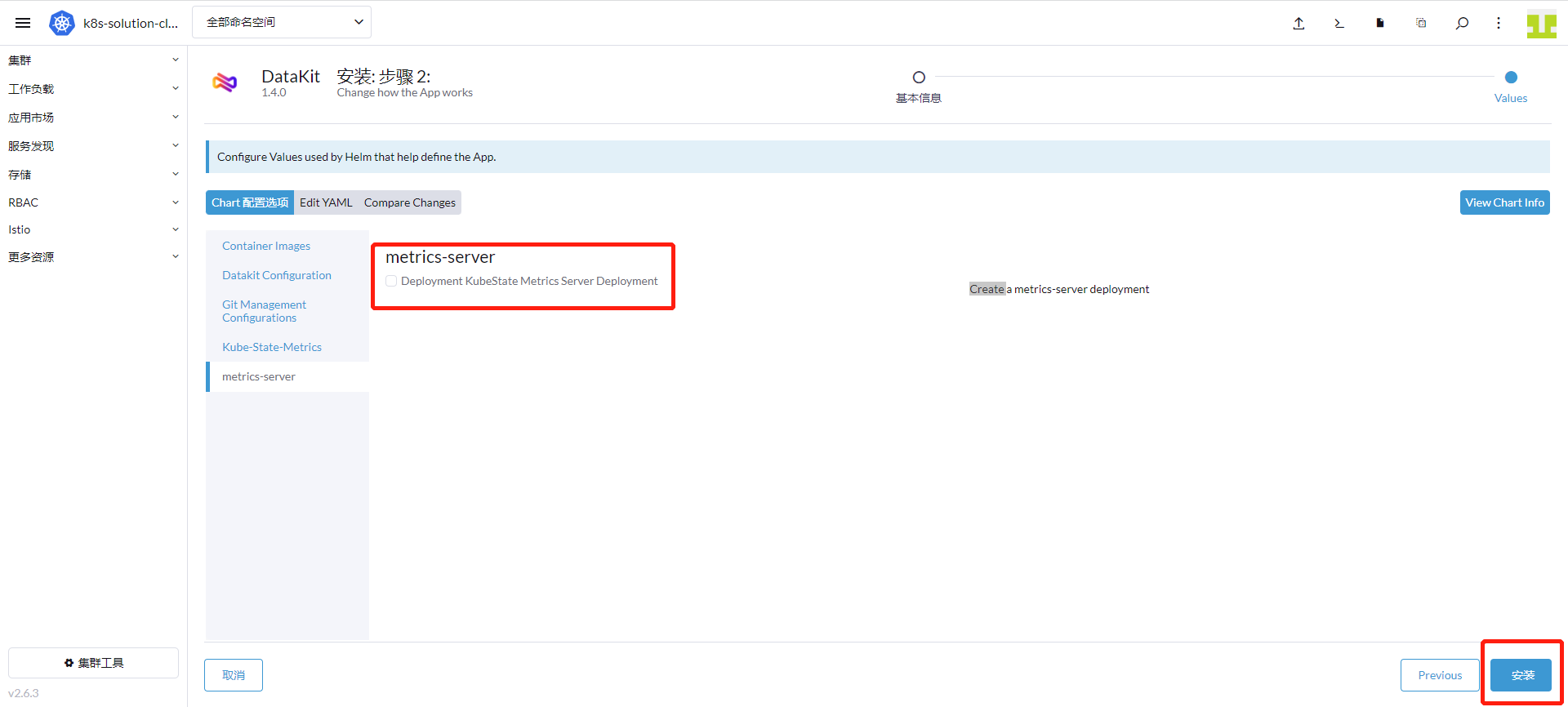 Click "metrics-server" and choose "Install", then click the "Install" button.