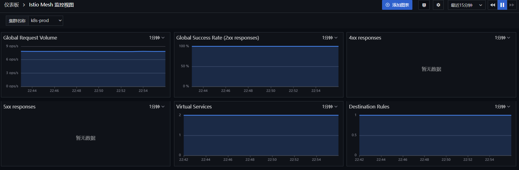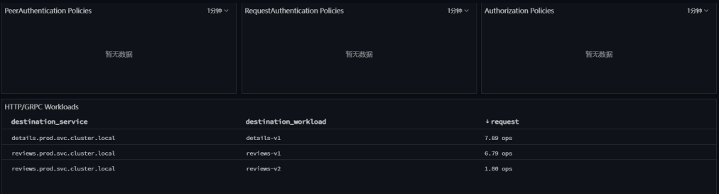 In the steps above, metrics collection has been done for Istiod and the bookinfo application. Guance provides four monitoring views by default to observe the operation of Istio.