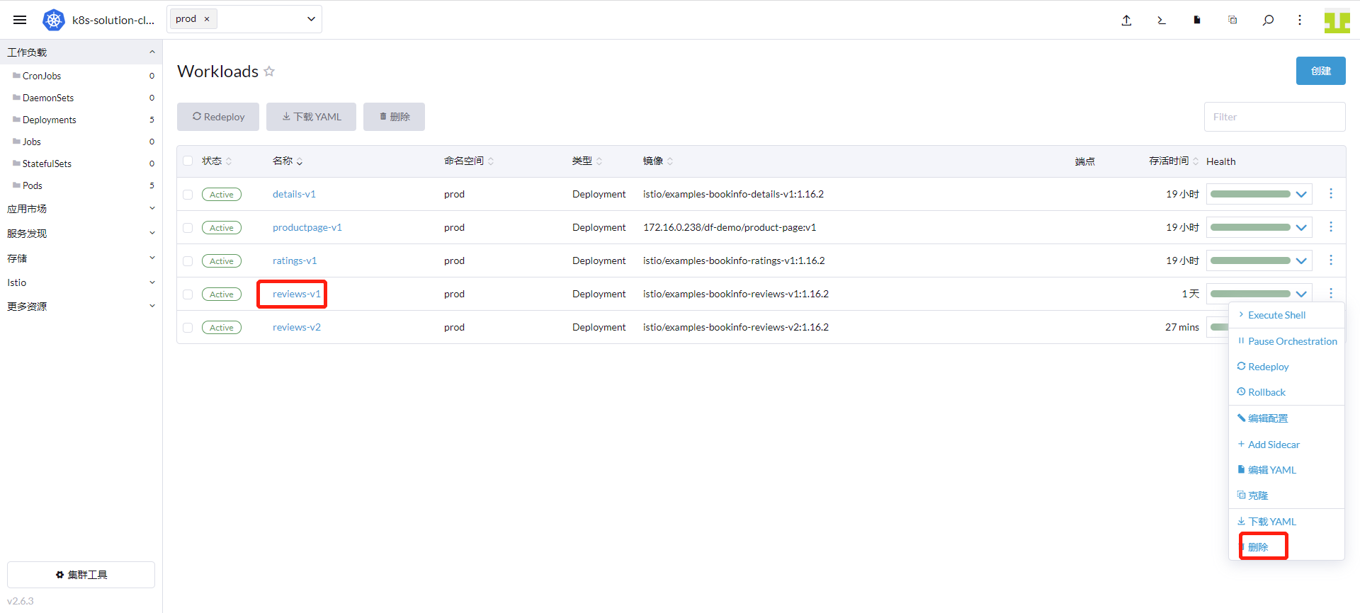 Go to "Cluster" - "Workloads" -> "Deployments", find "reviews-v1" and click "Delete".