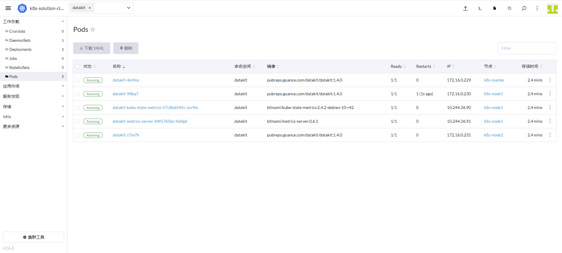 Go to "Cluster" - "Workloads" - "Pods", and you can see that there are 3 running Datakits, 1 kube-state-metrics, and 1 metrics-server in the datakit namespace.