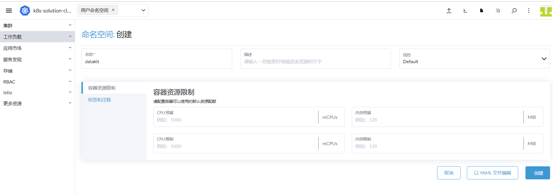 Log in to "Rancher" - "Cluster" - "Project/Namespace", and click "Create Namespace".