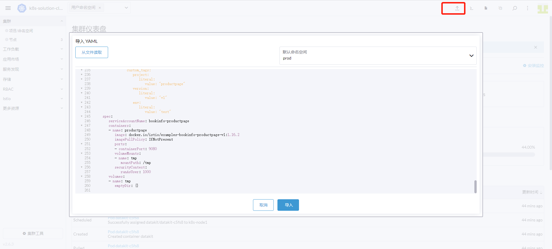Go to "Cluster" - "Workloads" -> "Deployments", find "productpage-v1" and click "Edit Configuration".