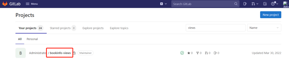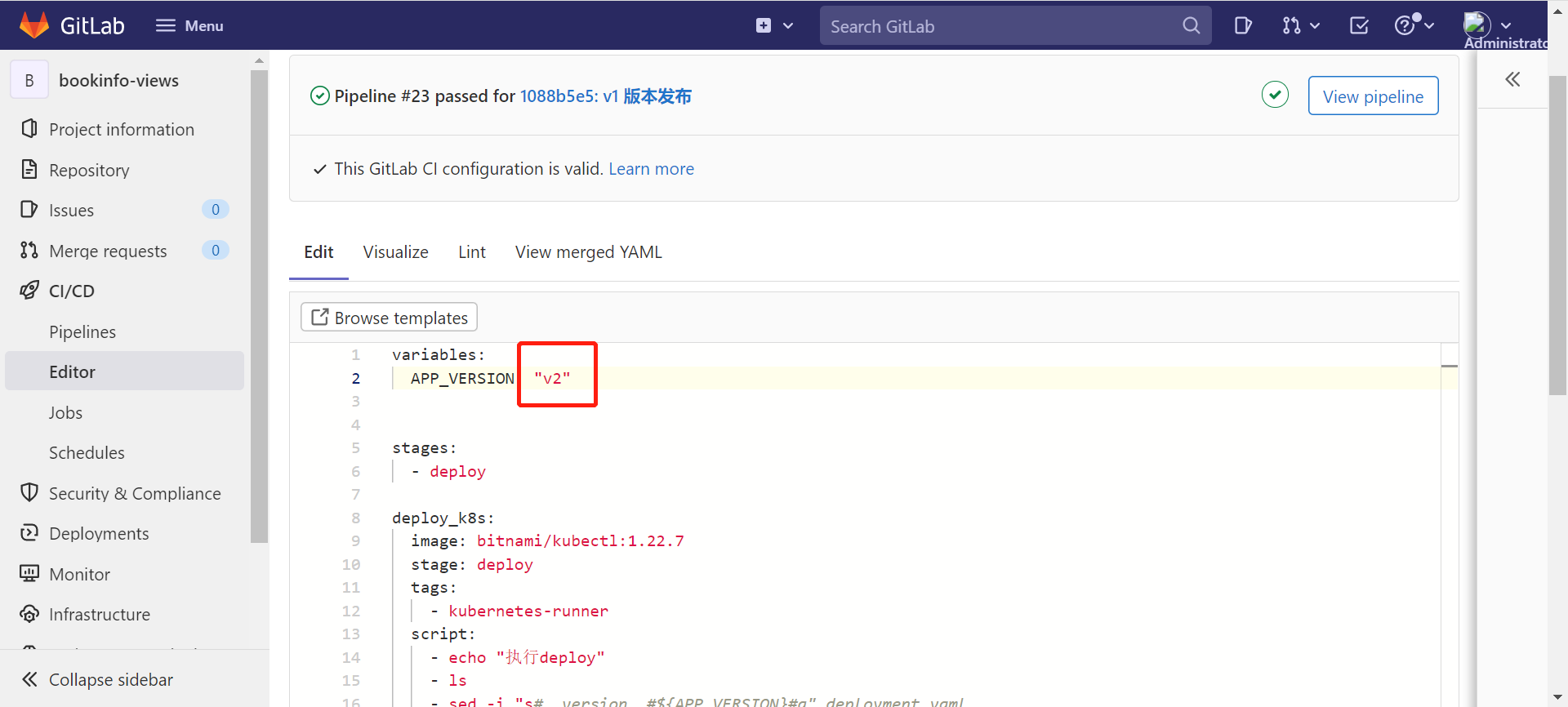 Log in to "gitlab", find the bookinfo-views project, modify the APP_VERSION value in the .gitlab-ci.yml file to v2, and commit the code.
