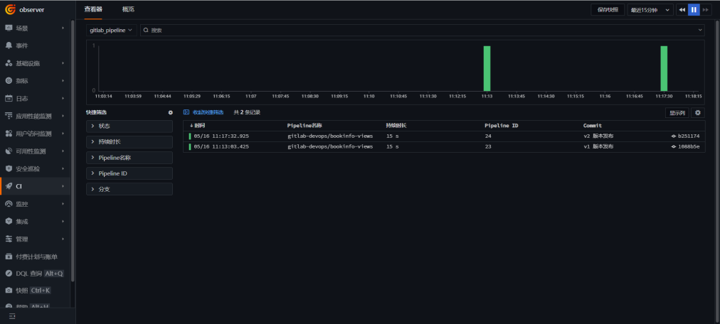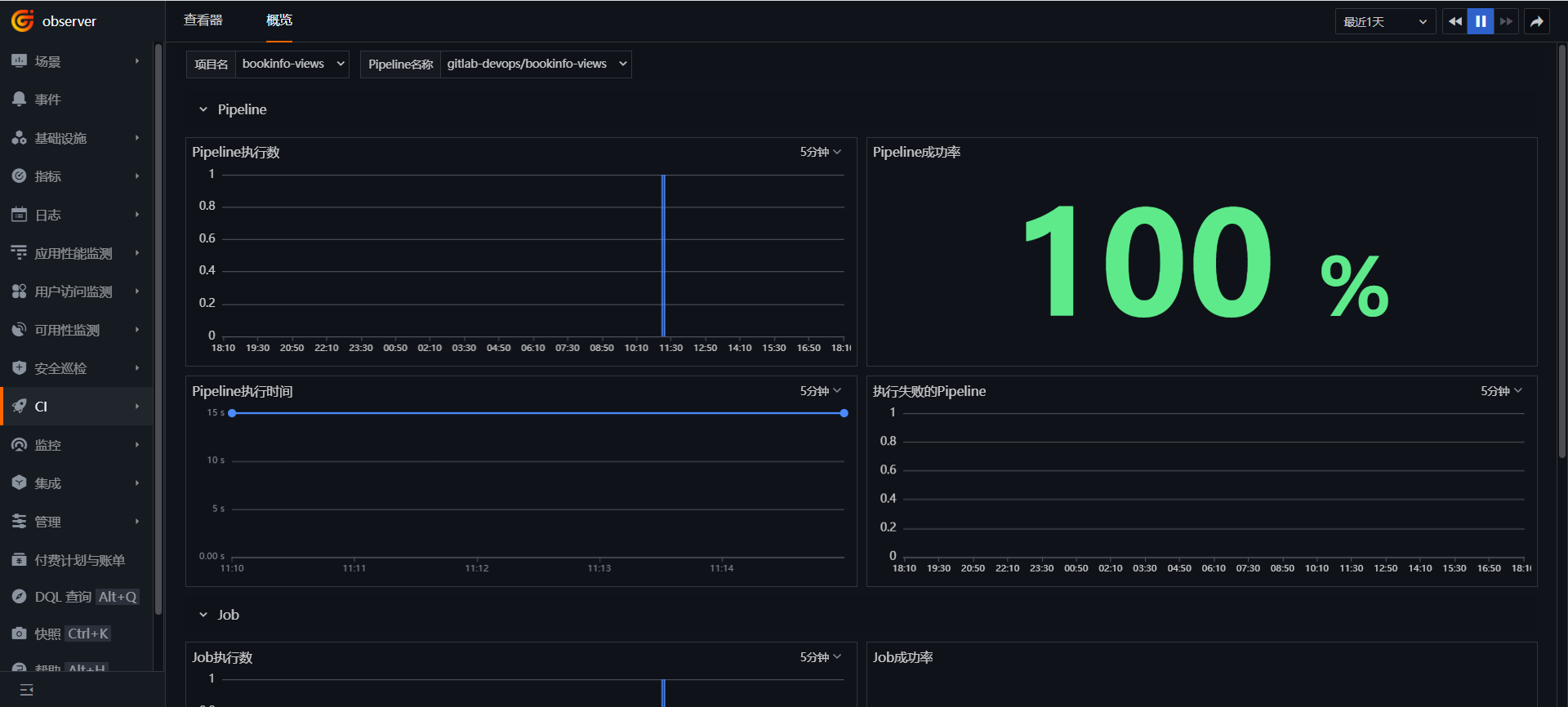 Log in to "Guance", go to "CI", click "Overview", select the bookinfo-views project, and view the execution status of Pipelines and Jobs.