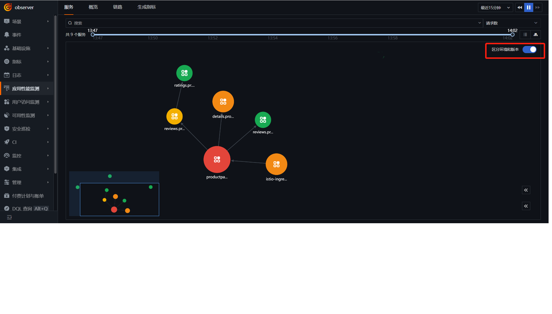 Turn on "Distinguish Environment and Version", and check the service call topology diagram for bookinfo.