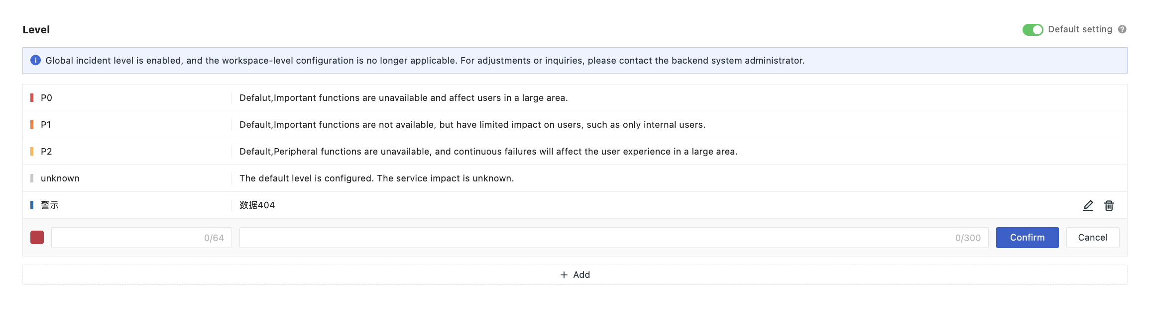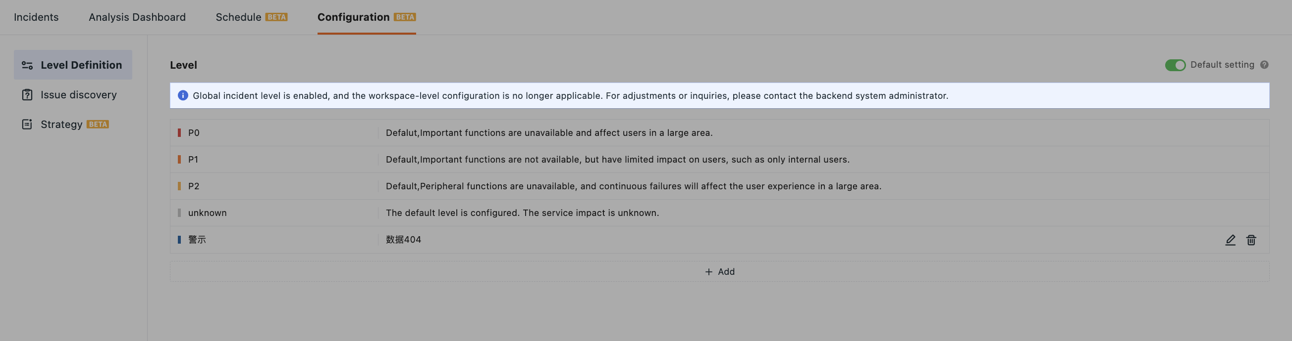 - The system supports managing Incident level configurations at the platform level. After enabling global configuration, the Incident level configuration at this workspace level will no longer apply;