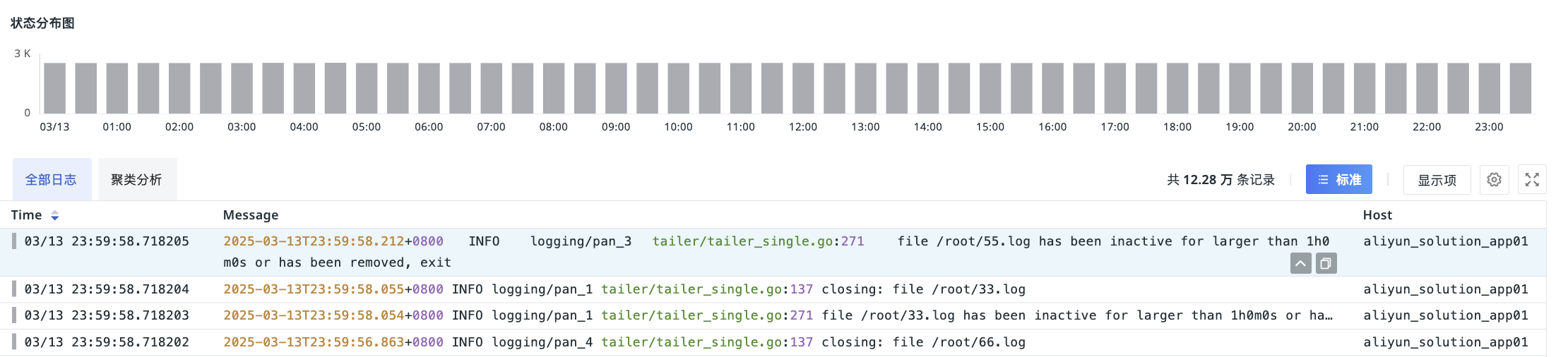 Based on the selected time range, the system will automatically divide multiple time points and display the quantity of different log statuses in a stacked bar chart to assist efficient statistical analysis. When logs are filtered, the bar chart will update in real-time to show the filtered results.