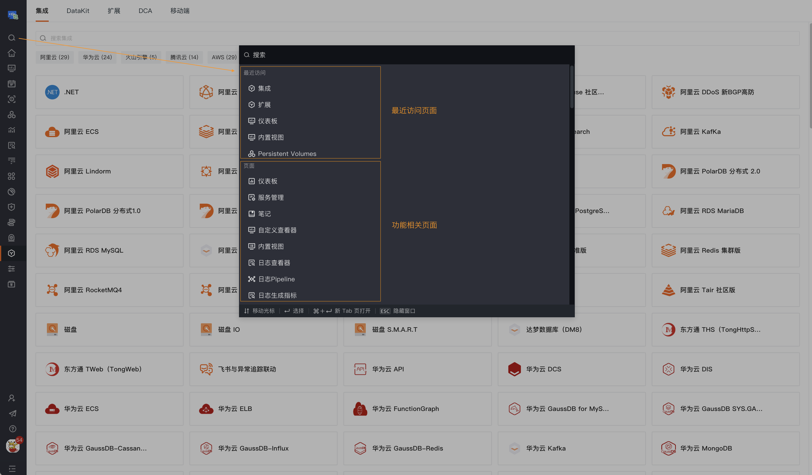 In the left navigation bar of the workspace > Quick Search, you can quickly view recently visited pages and other function-related pages in the current workspace: