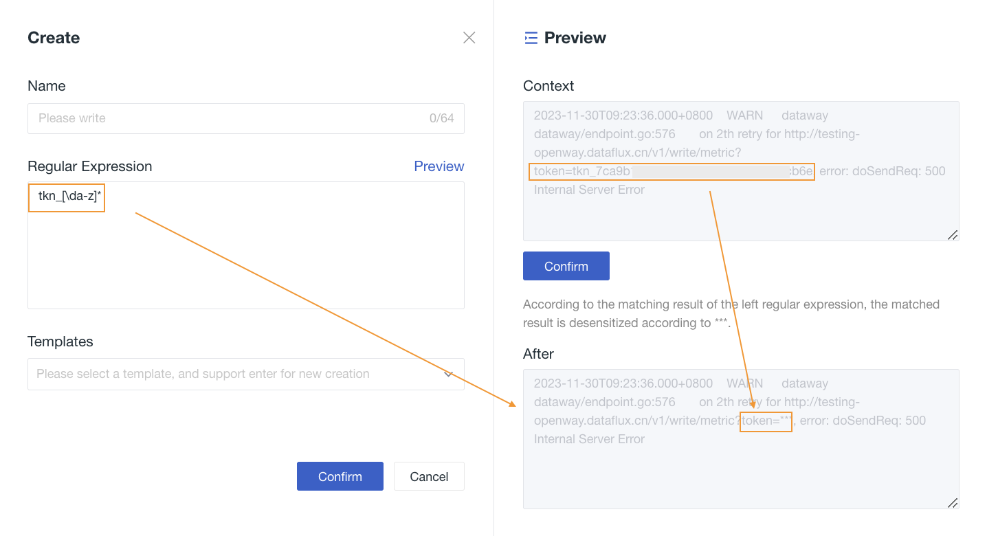 Enter the current rule name and regular expression, then click Preview. You can preview the masking effect in advance. The original text will be matched according to the regular expression on the left, and the matched results will be masked with ***.