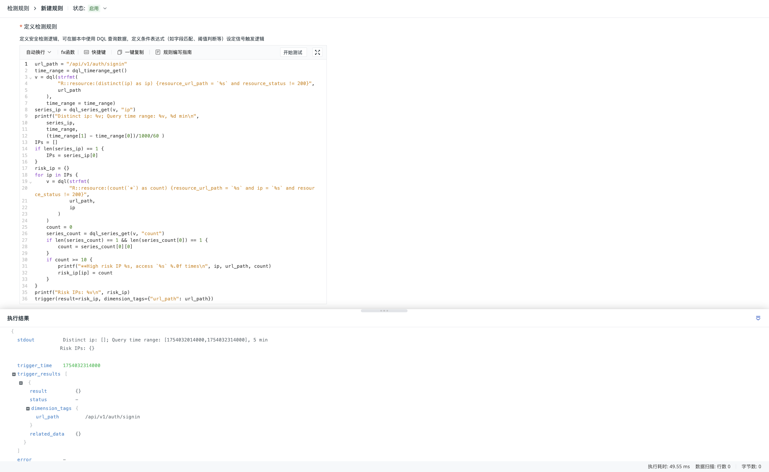 When creating and editing SIEM detection rules, Arbiter processes data by executing written scripts and generates events. Arbiter provides a series of built-in functions, including functions related to script input and output such as the dql function for querying data from Guance, the trigger function for triggering events, the printf function for outputting information to standard output, and more.
