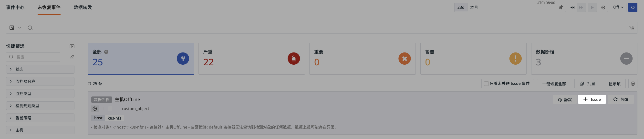 当监控器的事件通知规则配置完成后,若该监控器下产生了异常事件,将同步创建 Issue 异常追踪,您可以前往 异常追踪 > 您选定的频道进行查看。