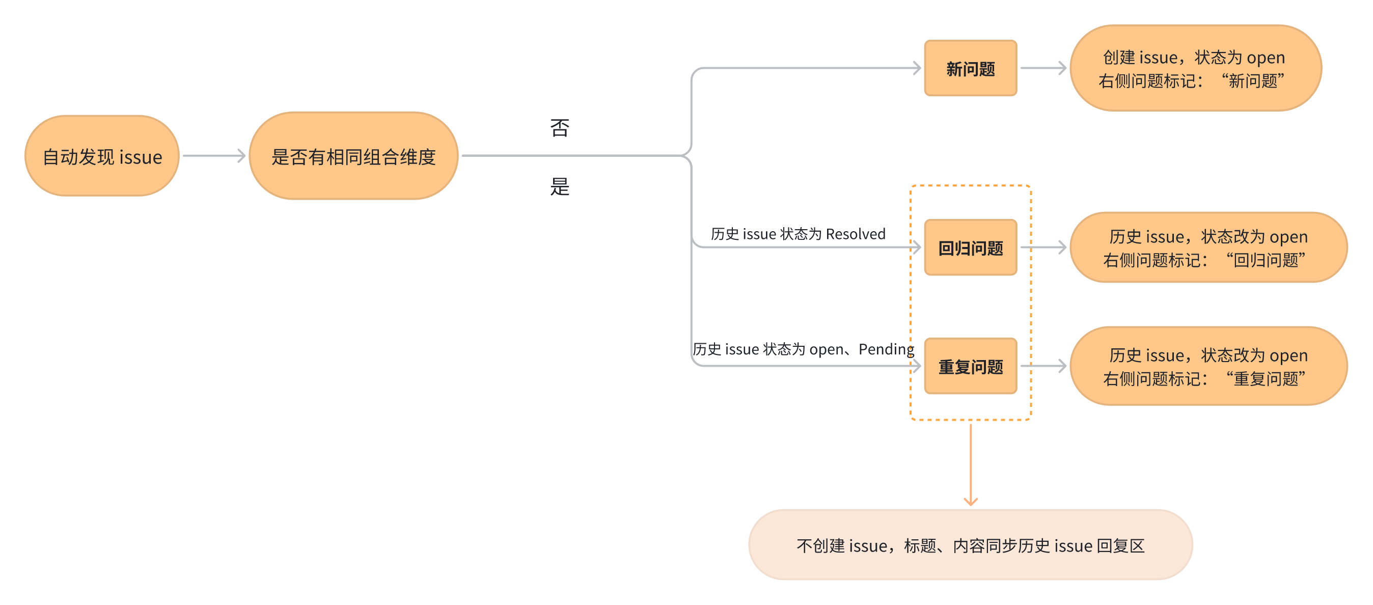 通过 Issue 自动发现创建的异常追踪 Issue 会以组合维度作为唯一的 ID,若历史已经存在了相同组合维度的 Issue,则不会创建一个新的 Issue,而是将内容追加到历史 Issue 回复区域做更新。一般情况下可以通过 “新问题”、“重复问题”、“回归问题” 的特殊标记来识别状态。