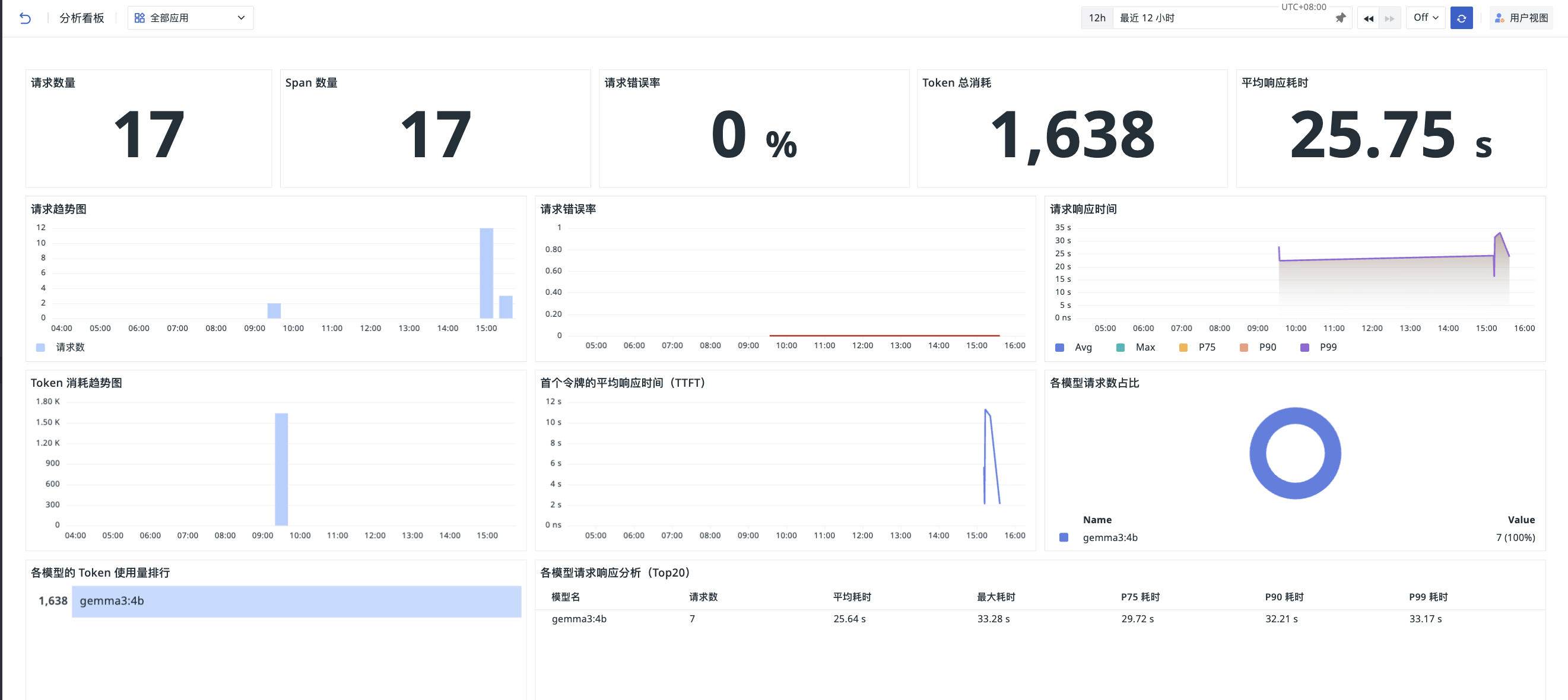 在 LLM 监测 > 分析看板,您可以以图表的形式查看选定应用下的多个指标信息。