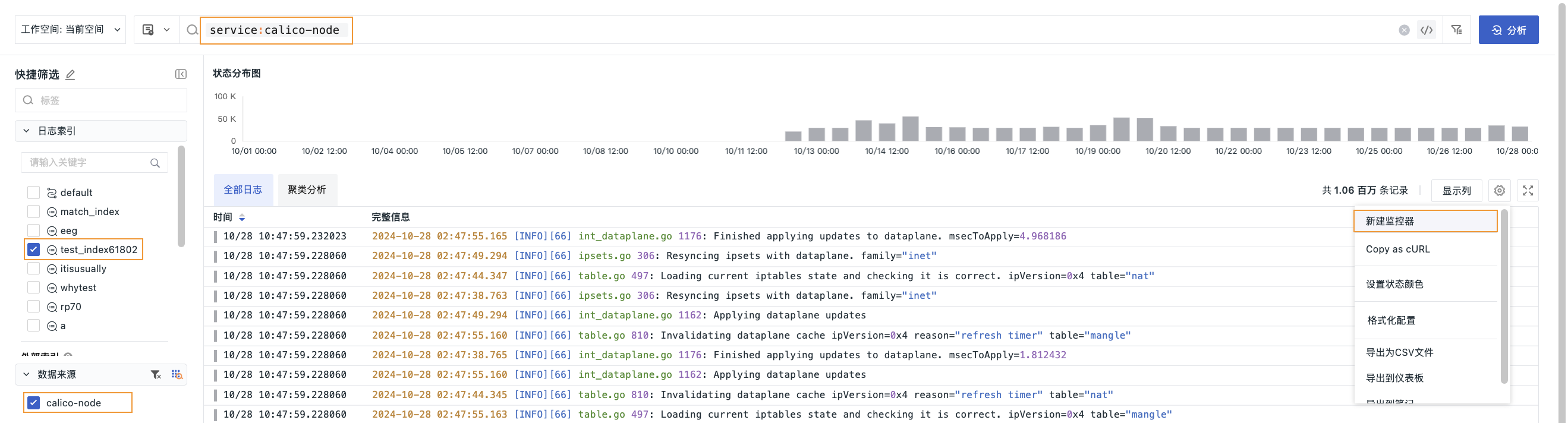 在日志中,您可以先筛选出所需数据,然后导出为 CSV、JSONL 文件或导出到仪表板、笔记中。