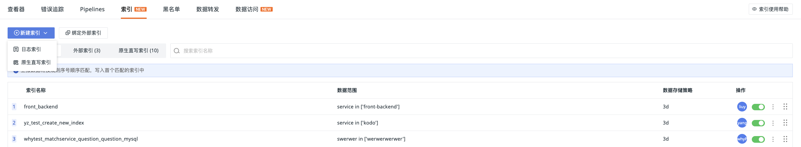 观测云支持创建或绑定三种索引类型: