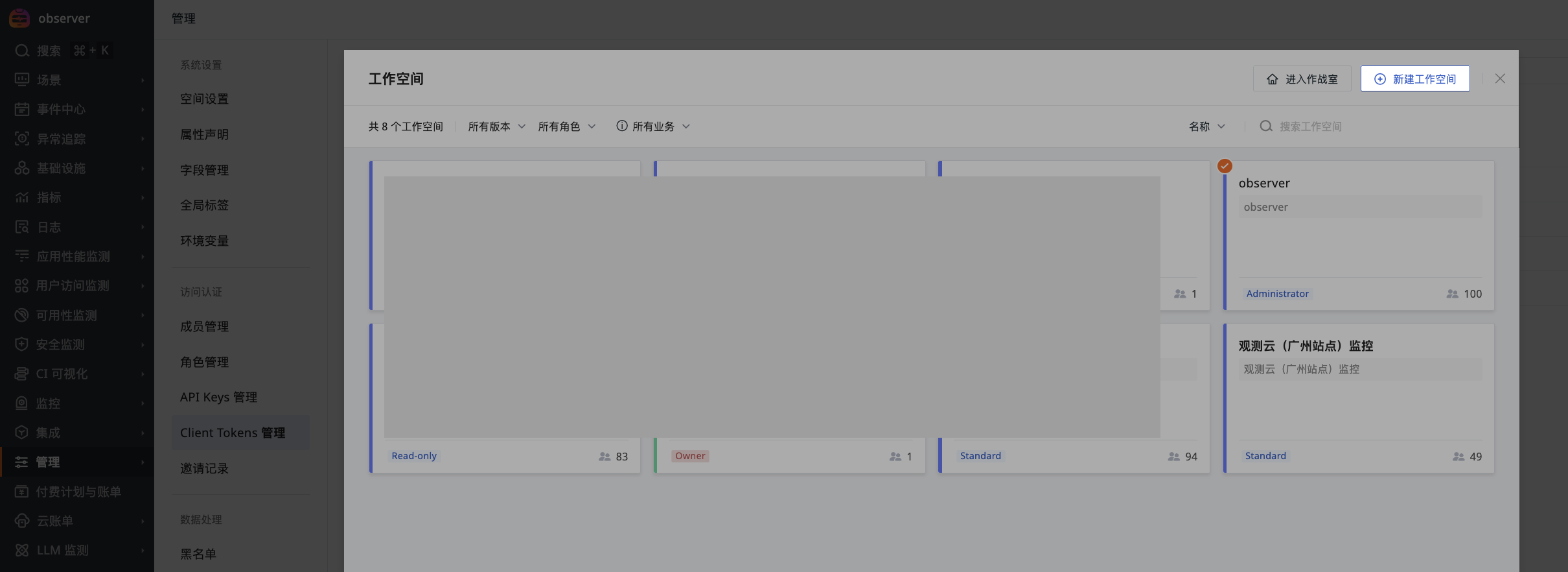 工作空间是观测云的基本操作媒介,通过控制台 > 管理,可查看和配置空间基本信息、成员权限、数据权限、API Key、通知对象、内置视图、图表及快照分享等功能。