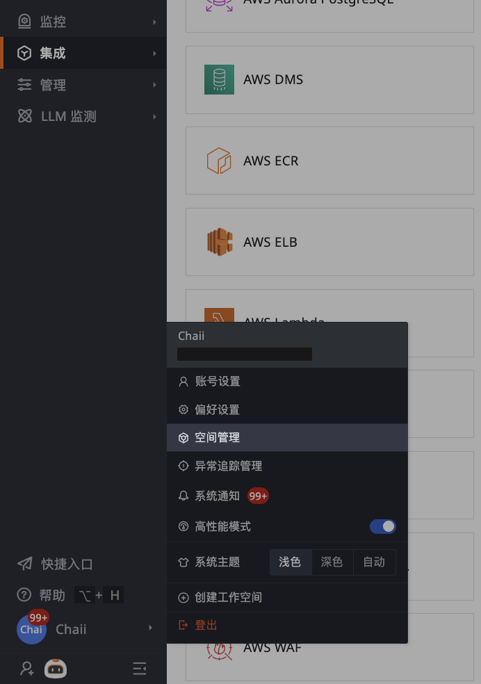 点击账号 > 空间管理,或直接点击控制台左上角工作空间名称,可查看以工作空间为对象的相关操作。