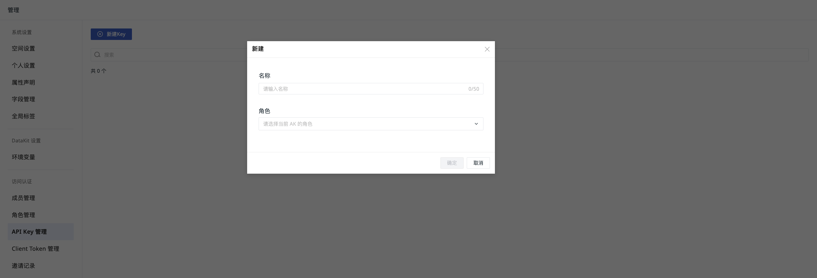 API Key 管理¶ 观测云支持通过调用 Open API 接口来获取和更新工作空间中的数据。在调用 API 接口之前,您需要先创建一个 API Key,用于身份认证。 关于 API 介绍,可参考 OpenAPI。 开始新建¶ 定义 Key 名称; 选择当前 API Key 的角色; 点击确定。 注意 若为该 API Key 选择了多个角色,最终权限将是所选角色权限的合集。 创建成功后,即可获取用于调用的 API Key ID 和密钥。