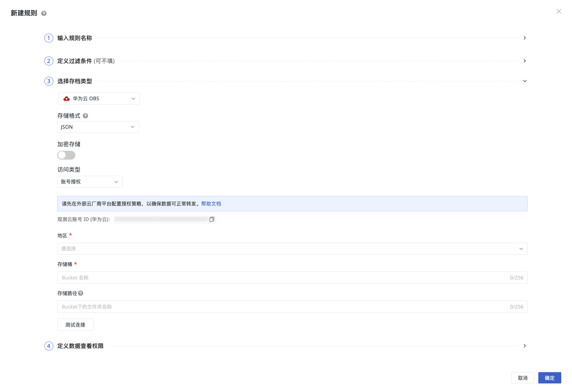 - 须使用观测云为您提供的专属华为云账号 ID,前往添加跨账号访问授权策略;