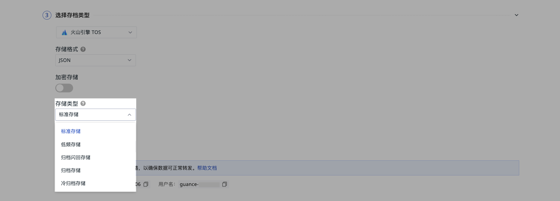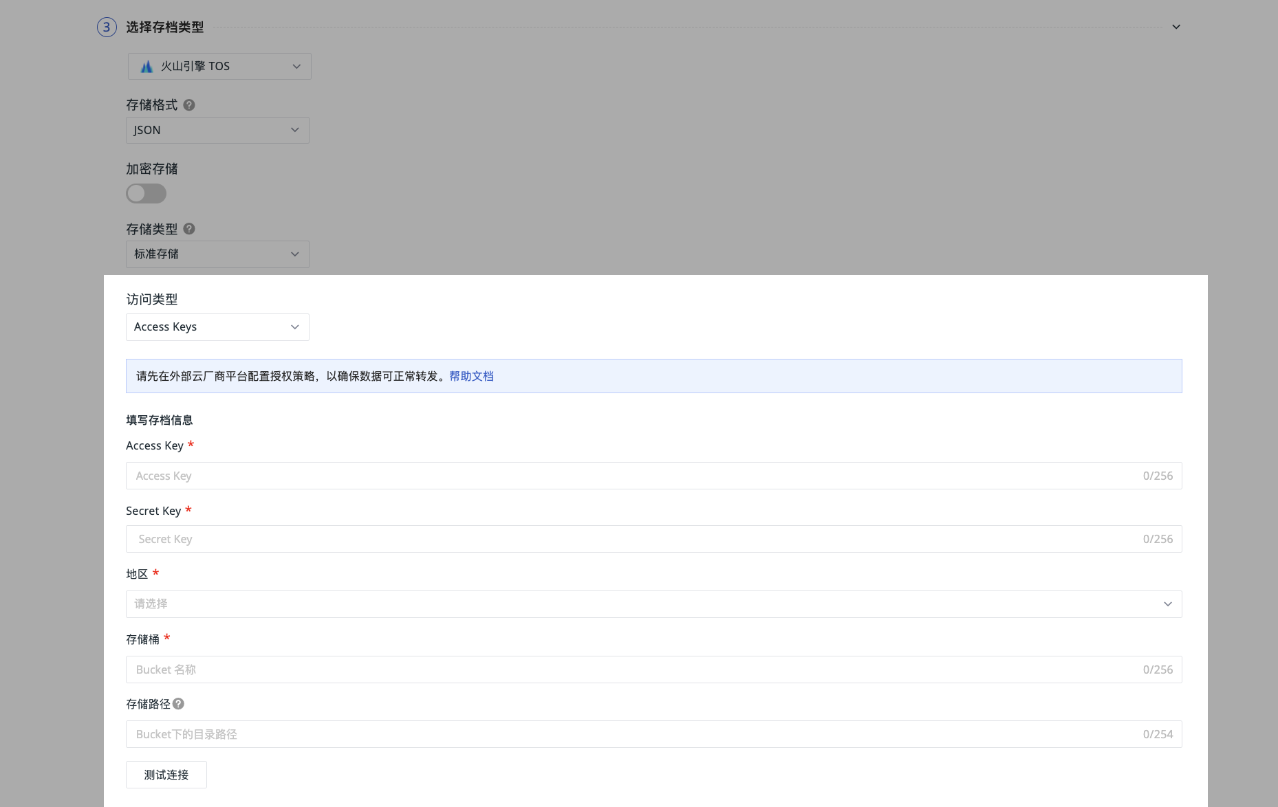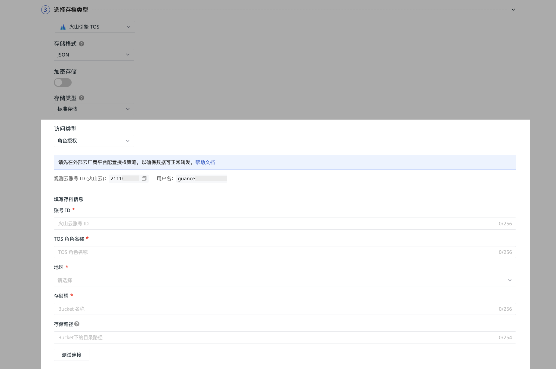 在火山云控制台配置授权策略后,填写存档信息,填入火山云账号 ID、TOS 角色名称、地区及存储桶名称;