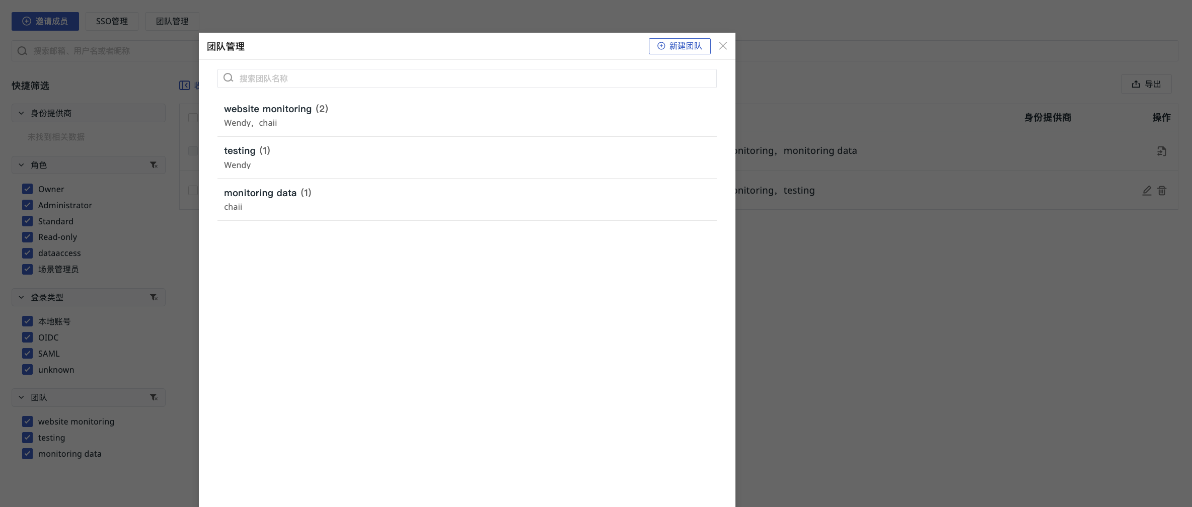 快捷筛选:按成员的角色、团队和登录类型快速筛选。