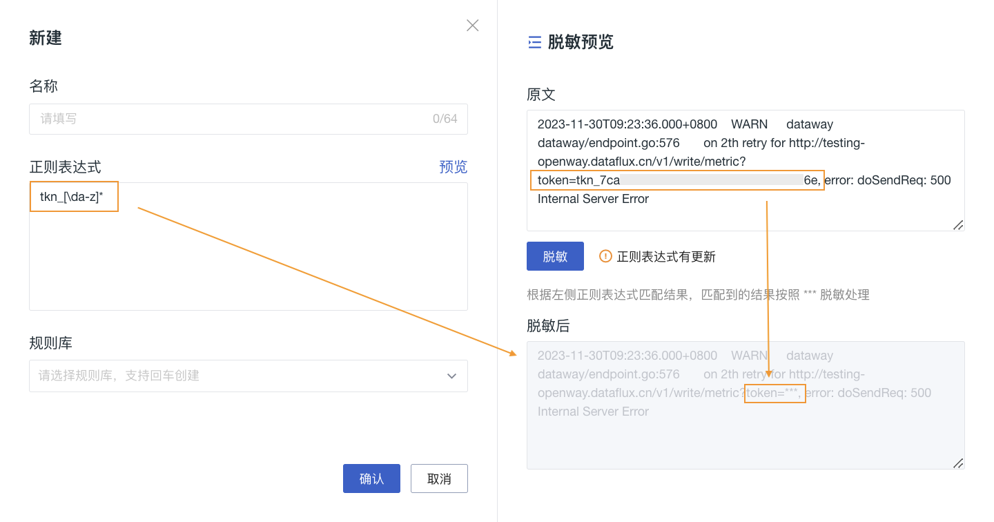 输入当前规则名称、正则表达式,点击预览,您可提前查看脱敏效果。原文会根据左侧正则表达式匹配结果,匹配到的结果按照 *** 脱敏处理。