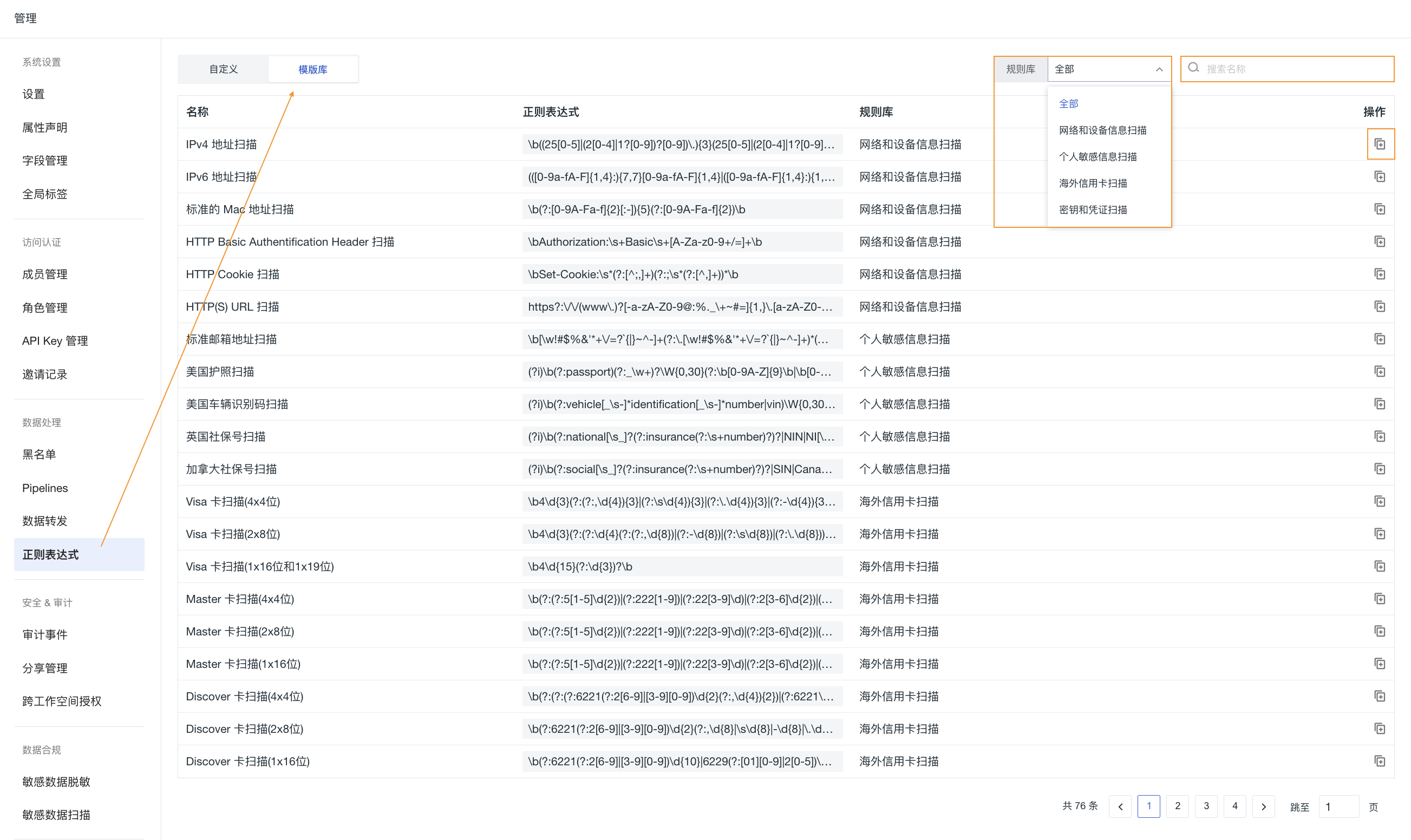 在管理 > 正则表达式 > 模版库,您可以看到系统内置的所有正则表达式模板,点击右侧操作下的克隆按钮即可使用。
