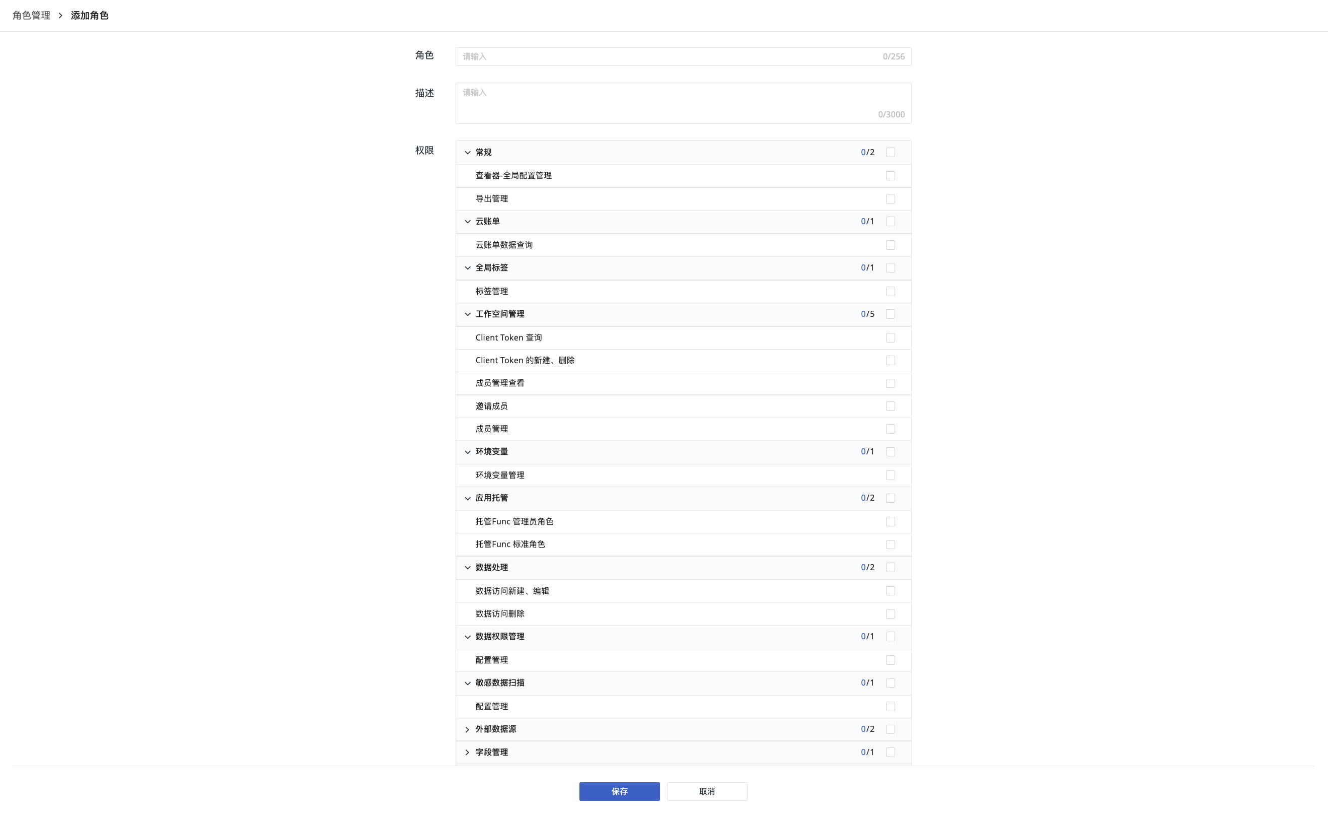 除了默认角色以外,您可以在角色管理创建新的角色,并为角色赋予权限范围,满足不同的权限需要。