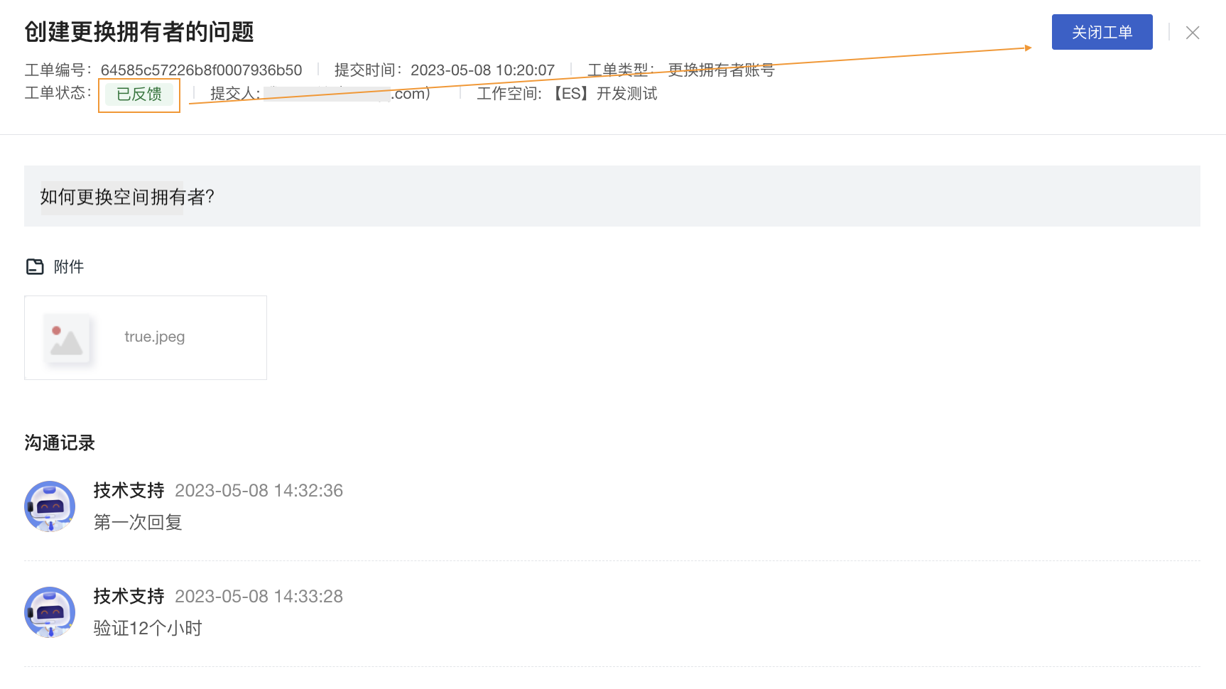 点击任意工单可查看该工单的状态、类型、提交人及所属工作空间等详细信息。在详情页,您与观测云可以相互沟通,在沟通过程中支持上传附件。