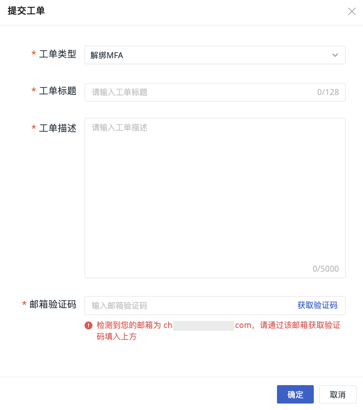 - 填入工单标题、描述和邮箱验证码,提交工单。