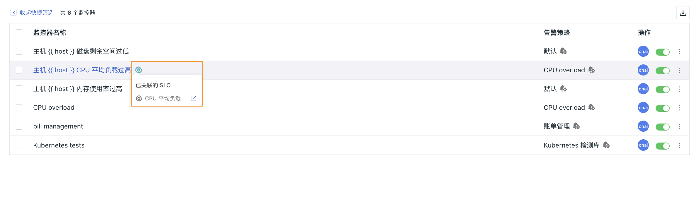 Hover 可查看关联的 SLO 列表,点击 可打开 SLO 详情页。