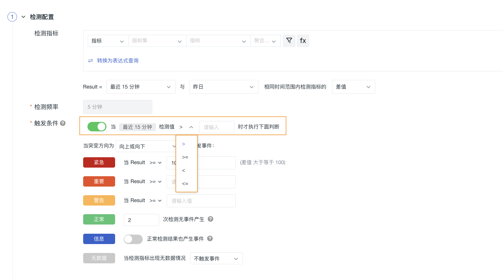 触发前置条件配置:默认开启;当检测值满足触发前置条件所设阈值时(运算符支持 >、>=、<、<= ,默认选中 >),再继续进行突变检测规则的判断;关闭该配置,只进行突变检测规则的判断;