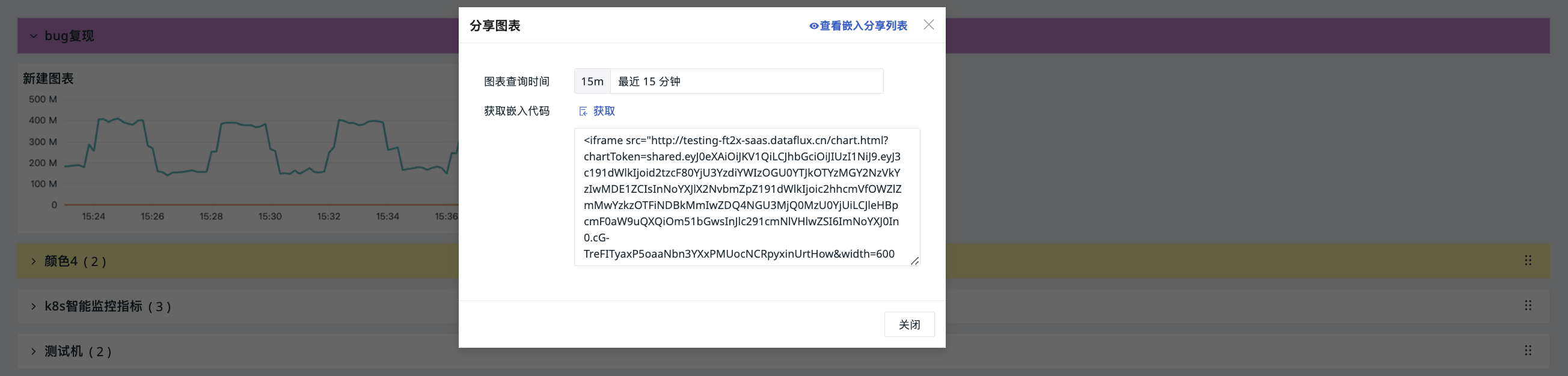 嵌入代码将根据图表的查询时间生成。例如,若图表查询时间为最近 15 分钟,则嵌入其他平台后,图表将显示最近 15 分钟的查询结果。