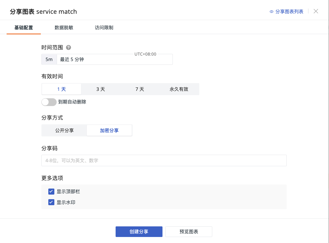 时间范围:系统默认选中当前仪表板图表的时间。后续该图表被分享后,被分享人可查看的图表时间区间;