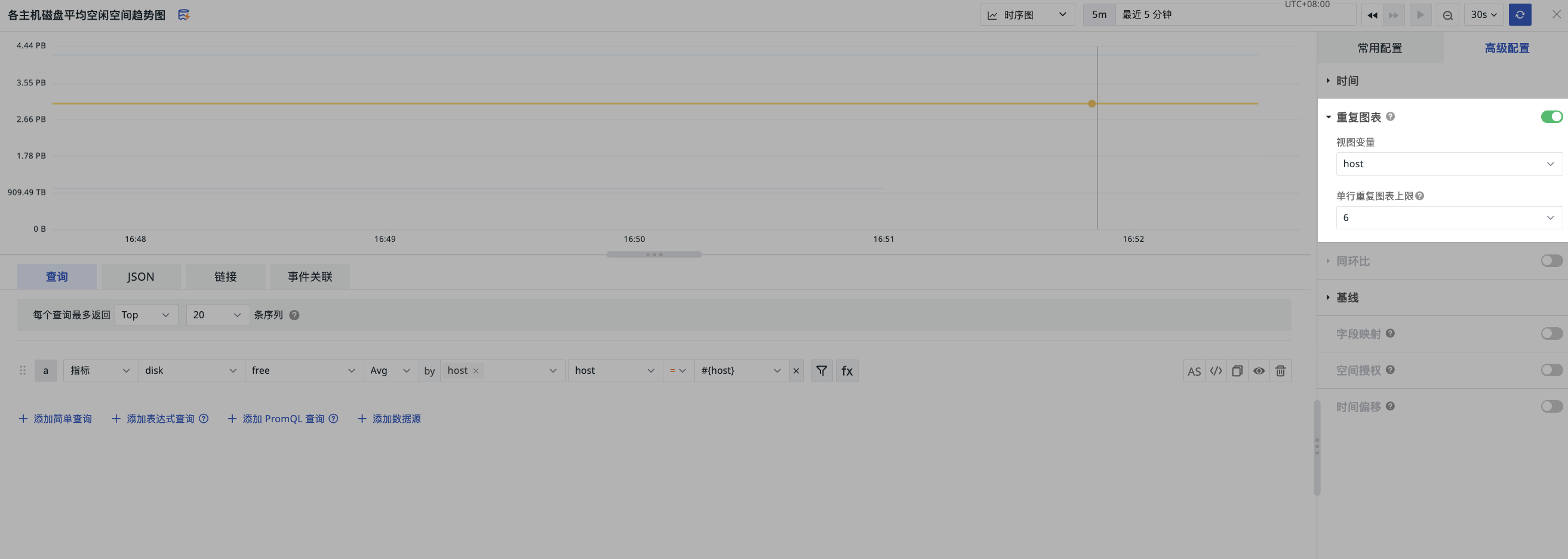 在设置图表时,系统会根据您在图表 > 高级配置中配置的“最大返回点数”,自动为您推荐合适的时间间隔选项。若没有设置,“最大返回点数”默认为 720。