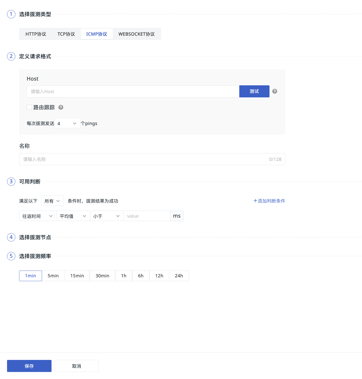 - 名称:自定义 ICMP 拨测任务的名称,当前工作空间内不允许重复。